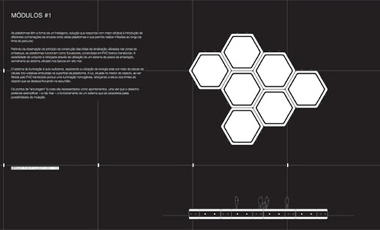 Floating Landscapes (2003)----------------------Floating Landscapes was presented in Armazém K7, as part of the exhibition Linha de Água (Waterline) in the scope of the Portuguese Design Biennale - Experimenta Design. It consisted of a commission of a study proposal for a waterfront area, located in a coastal town near Lisbon. The solution consisted of several hexagon rubber floaters of approximately 6m wide, brought together in order to draw lines that connected different points of the coast. Each hexagon would have a number of small devices that captured solar energy during the daytime and spread it during the night, lighting up its top surface. At night the different sequences of elements would work out as light paths, signalizing the limits of the coast, while during daytime they would suggest new pedestrian paths. ----------------------Title: Paisagens Flutuantes